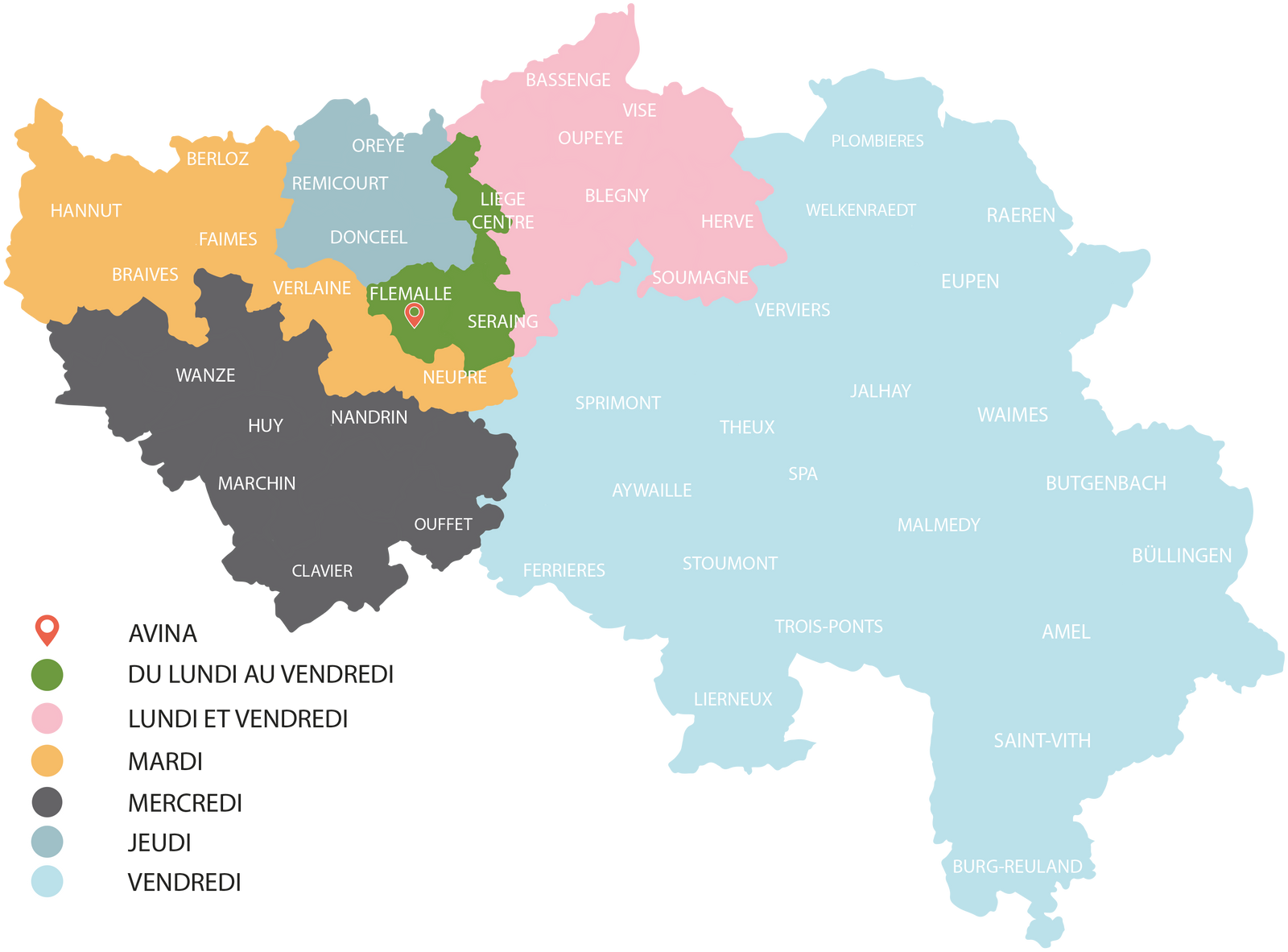 Hors province de Liège : AVINA vous livre via transporteur, les frais de livraison étant calculés au moment de la finalisation de la commande.
